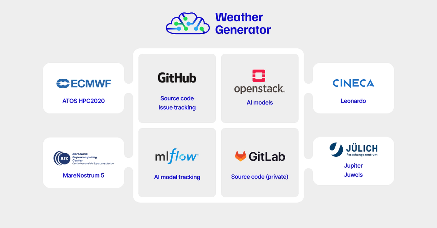 The WeatherGenerator project is an ambitious Europe-wide project to build a “Large Language Model for the weather.” From the outset, this leads to a very practical challenge: how to coordinate the development of a state-of-the-art model across 6 High Performance Computing (HPC) systems and 10 research groups? Each HPC system is custom built with the purpose of maximizing processing power at the expense of ease of use or convenience. This experience is very different compared to using a public cloud such as Amazon Web Services, Azure, Google Cloud. Public clouds are meant to be cost effective to build and operate. They are the Ford T’s of large computing: easy to use, simple, adapted to many scenarios. Public cloud operators put a large focus on standardization and automation as well as ease of use for the final customers.